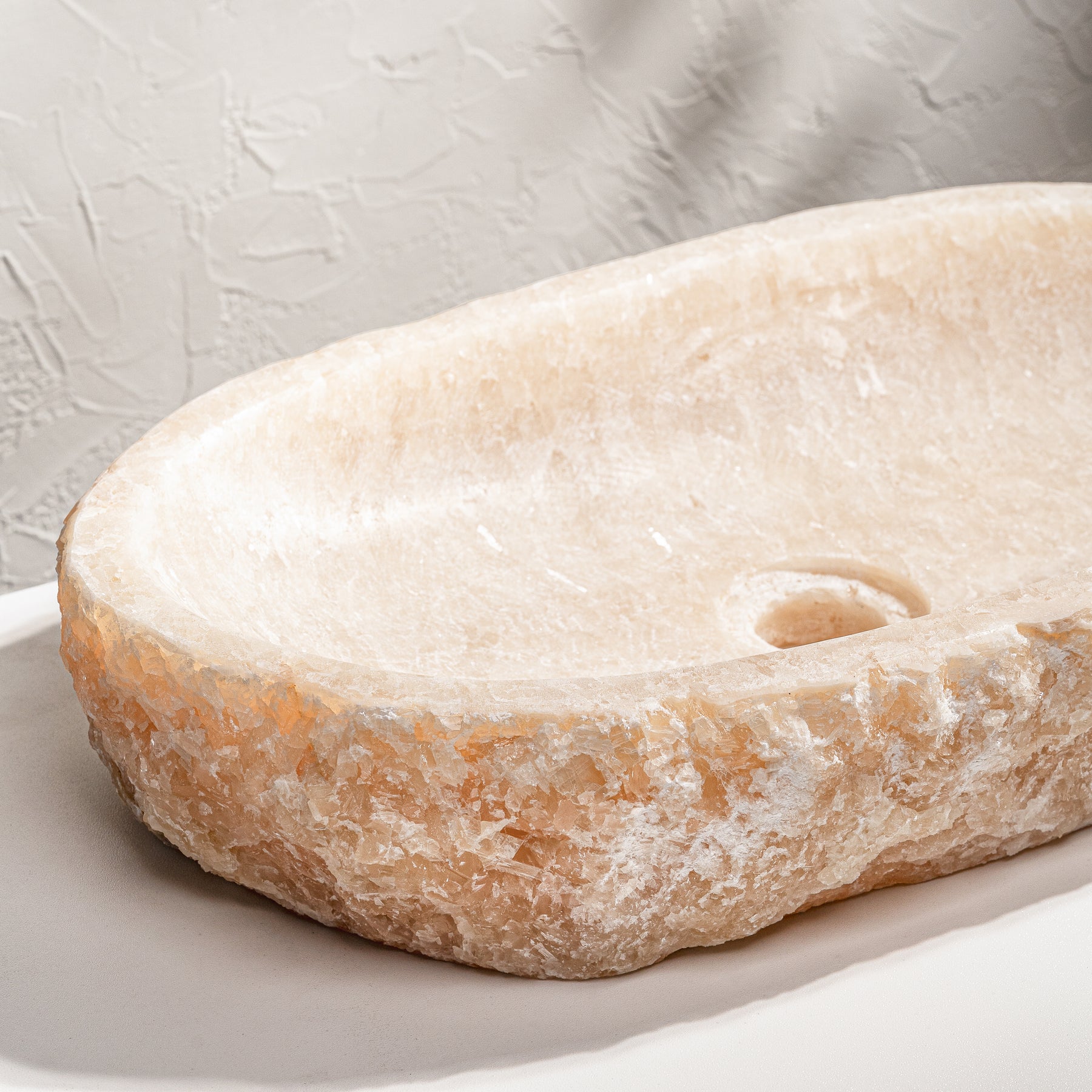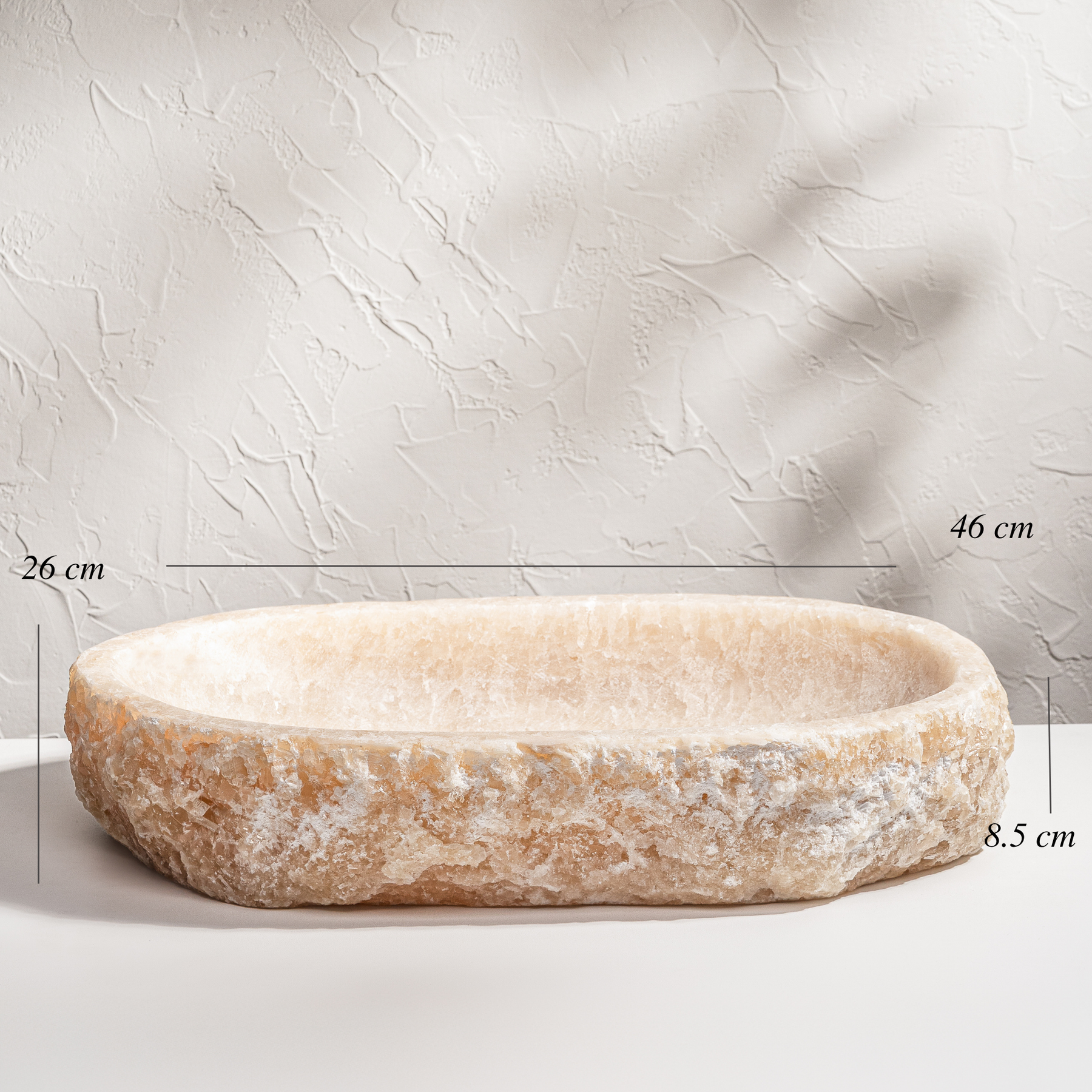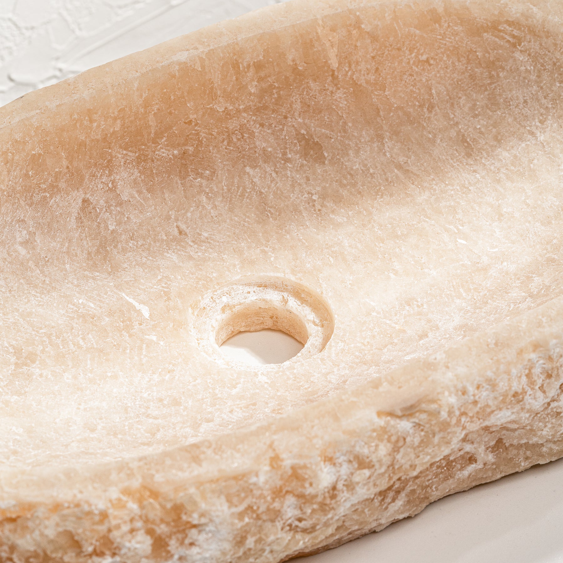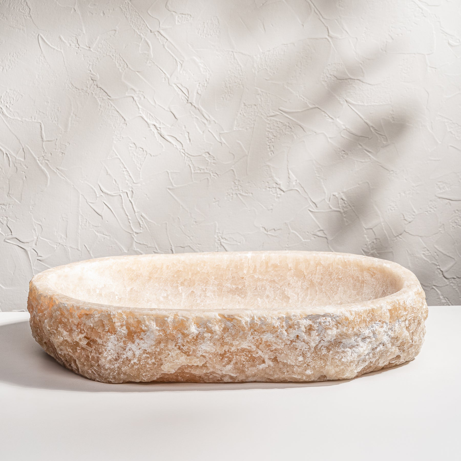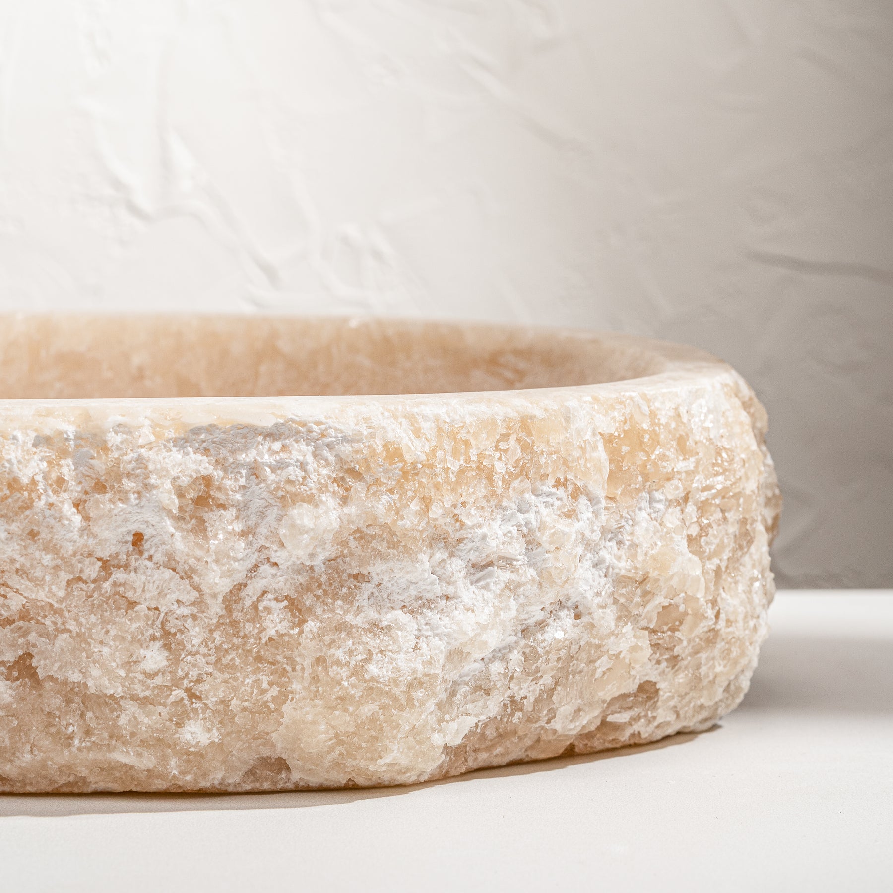 Carved from a single piece of natural onyx, the Aurora Onyx Basin captures the quiet beauty of raw stone in its most organic form. Each basin is hand-sculpted, revealing a soft, translucent warmth that glows gently under light. With its naturally textured exterior and smooth interior, it brings a sense of calm, timeless elegance to any space.